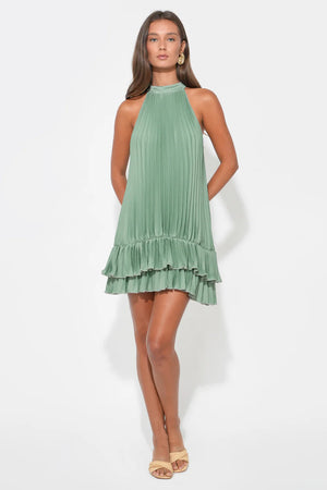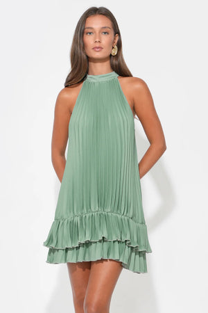 The halter neckline provides an elegant, shoulder-baring silhouette that draws the eye upward and creates an elongated frame. The standout feature is the all-over pleating, which adds incredible movement, depth, and a touch of shimmer as the light hits the fabric.