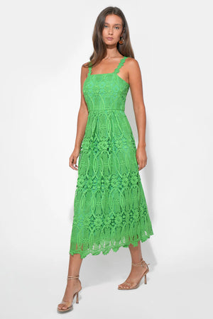The dress is defined by its intricate floral lace overlay, which provides a rich, three-dimensional texture across the entire garment. The midi-length hemline often features a sheer lace border, adding a touch of lightness to the silhouette.