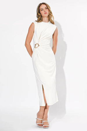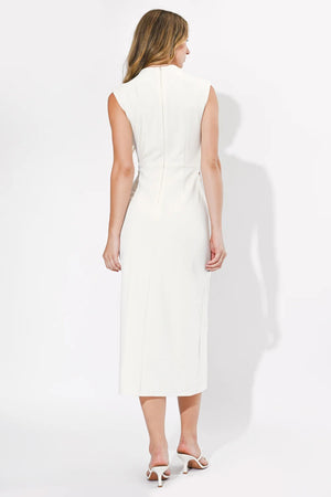 Rendered in a clean, luminous Ivory, this dress features a stunning twisted waist detail that creates a natural cinched effect and elegant ruching across the midsection. The midi-length silhouette offers a refined and modest hemline, while the tailored bodice provides a structured yet feminine fit.