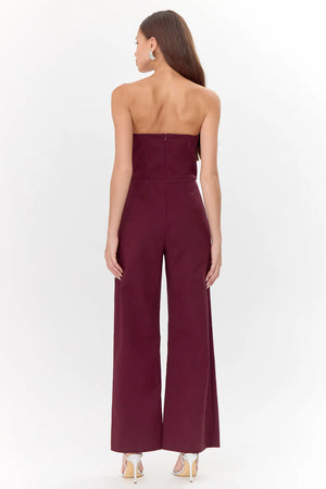 This strapless jumpsuit is most noticeable for it's wavy neckline. The assymetrical curves and sleek structure perfectly balance together. This piece is immediately placed in a formal setting but can be styled to dominate anywhere else.