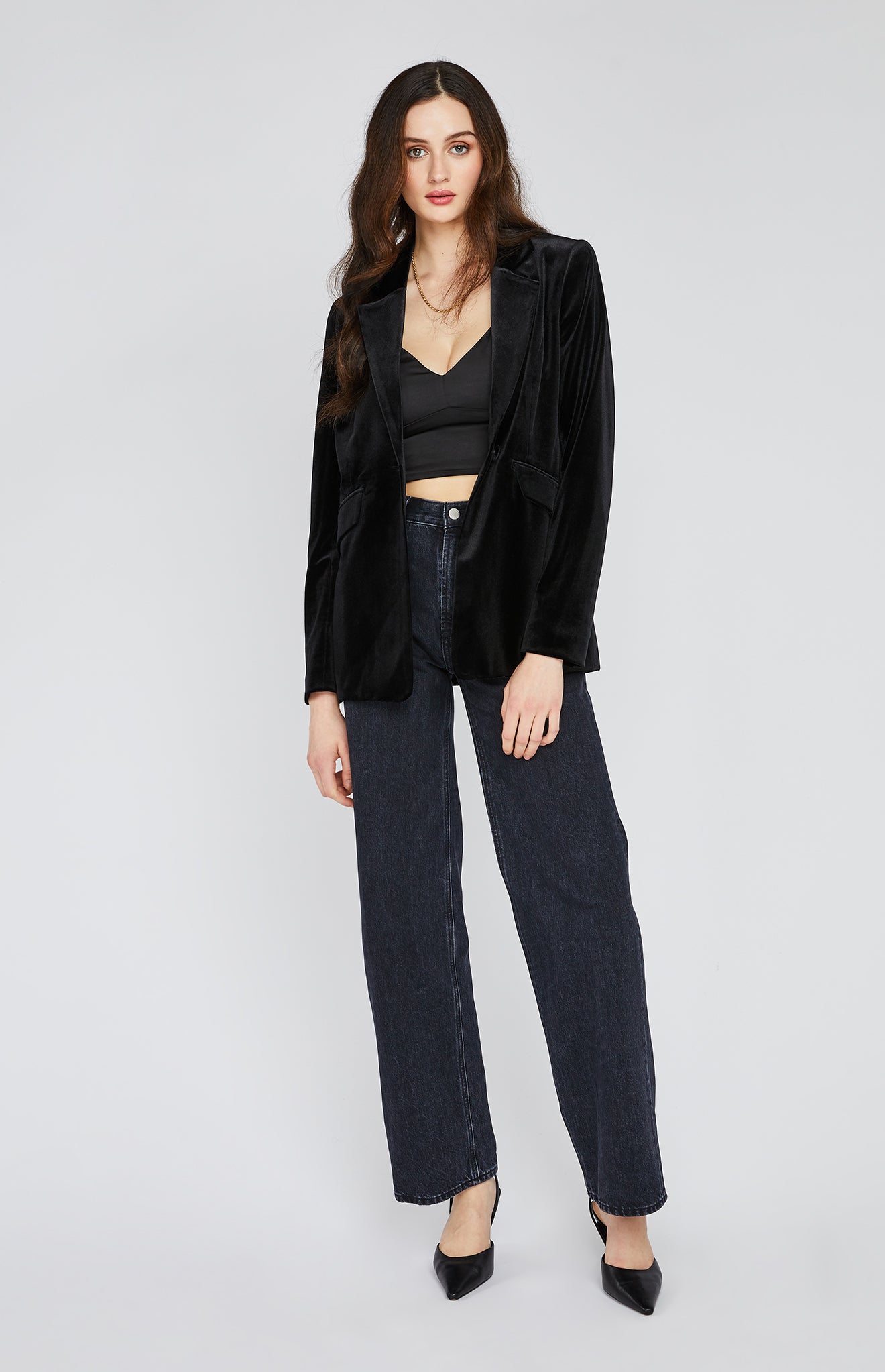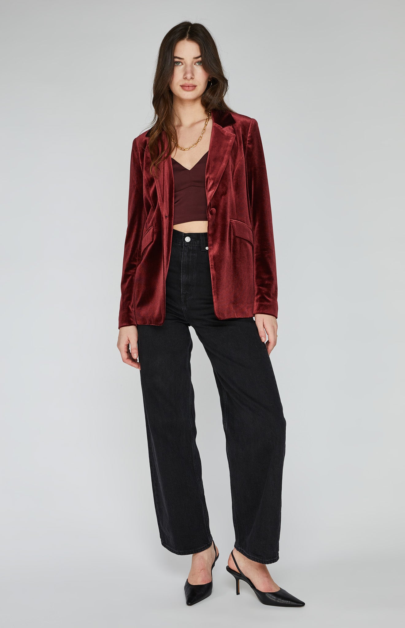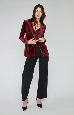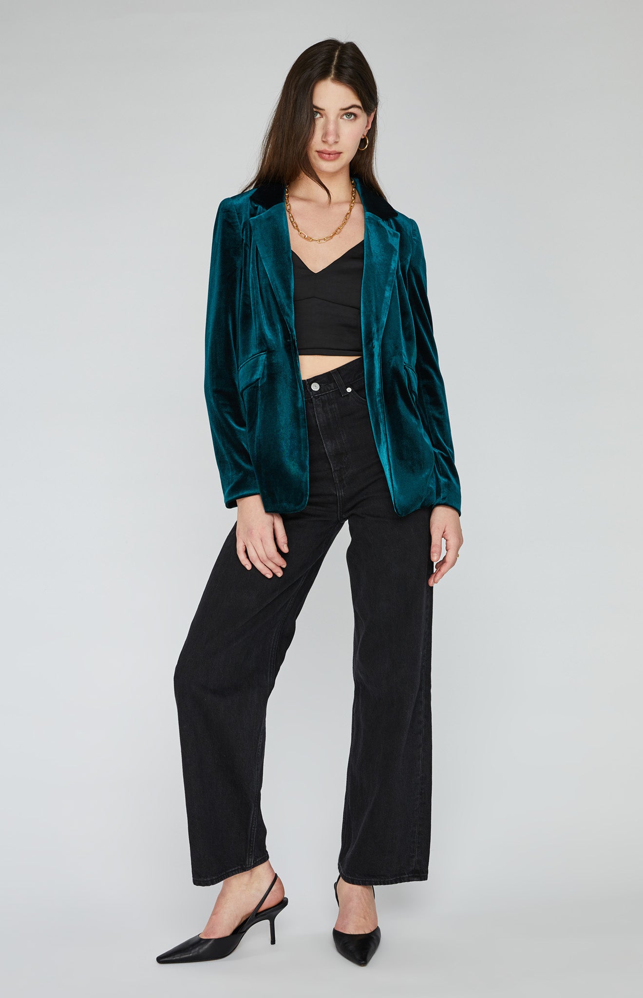 The Candace blazer is made of a luxe velvet that drapes beautifully when worn Features include welt pockets with a flap, and shoulder pads for a perfectly tailored feel. Complete the look with the Lopez pant.