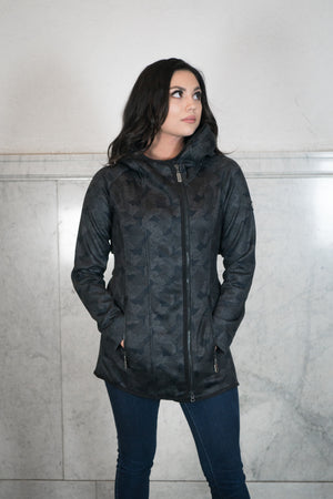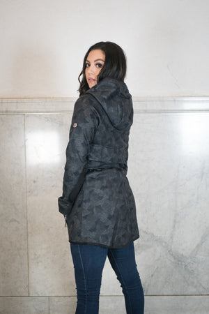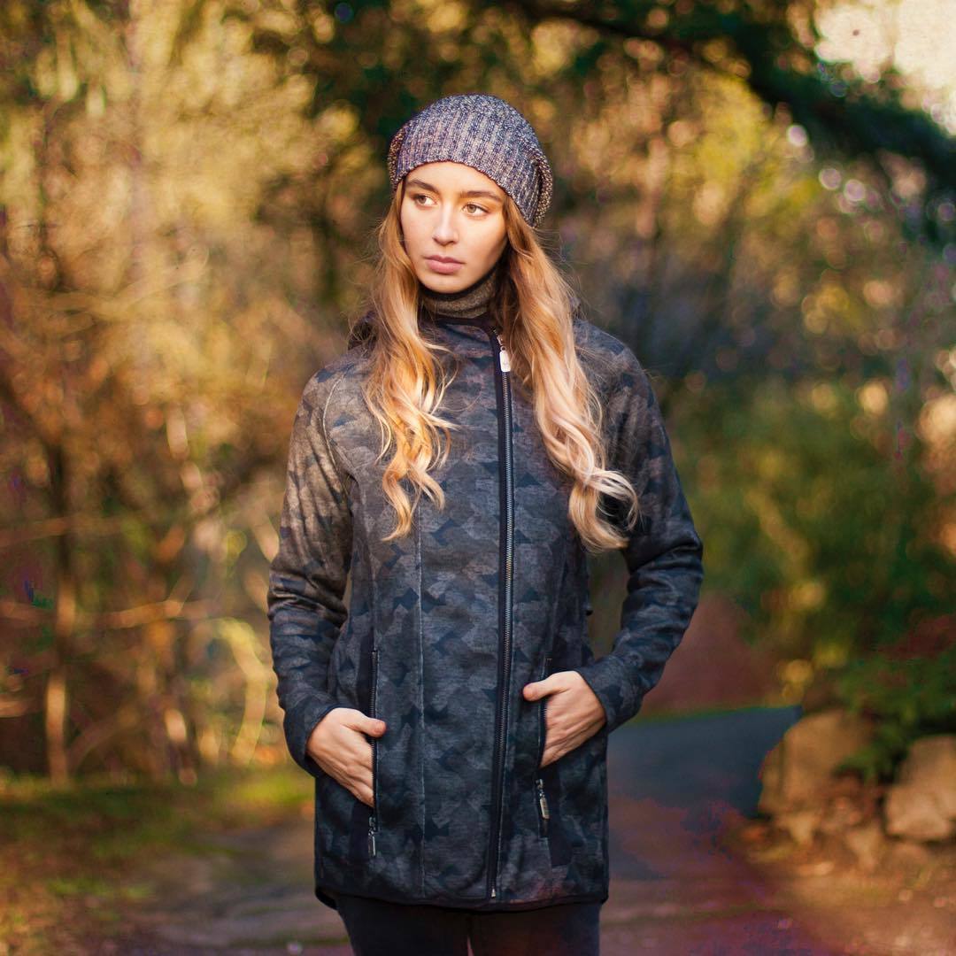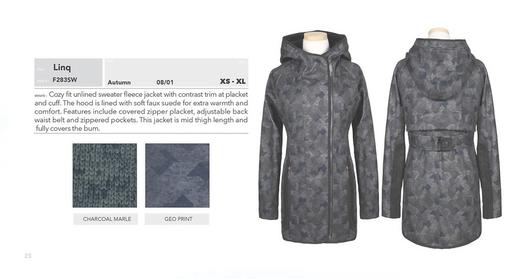 Get lots of wear from this then-month jacket.  Perfect for Fall, Spring, and mild winter days.  Cozy fit unlined sweater fleece jacket with contrast trim at placket and cuff.  The hood is lined iwth soft faux suede for extra warmth and comfort. Features include covered zipper placket, adjustable back waist beld and zippered pockets.