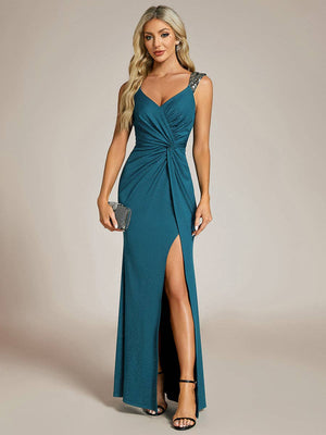 Fitted dress with twist front ruched detail, glitter fabric and front slit.