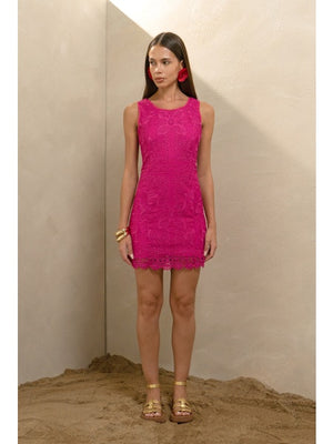 Sleeveless, lace dress with a floral pattern. Rendered in a deep pink, the garment falls to a short length and show's off a classy structure that's suitable for most special occasions.