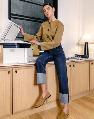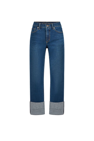 Meet Faye the jean that gives you options . You can wear it cuffed at 27" for a laid-back vibe or uncuffed at 32" for a sleek straight-leg silhouette. The dark-blue wash and oversized turn-up cuff add a cool, off-duty edge to your everyday look.