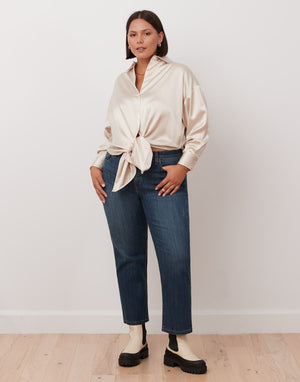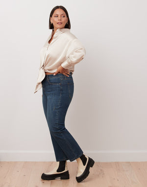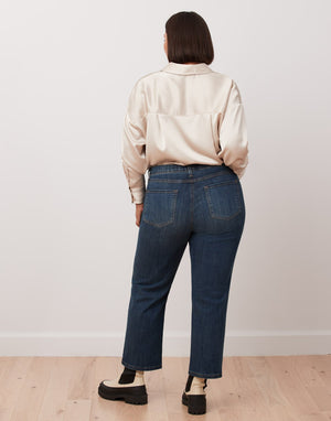 Chloe, our classic straight leg silhouette, is fitted throughout the hips and straight cut from the knee down. This high-rise jean features a 26" inseam and a cropped length at ankle. This style gives off true vintage vibes with its classic blue color.
