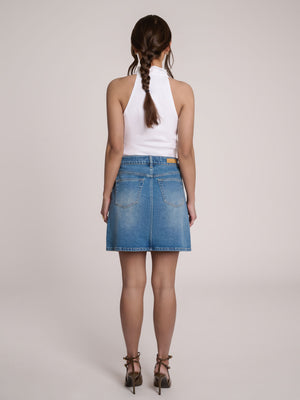 Add a classic touch to your wardrobe with our Forget me not denim Mini Skirt. Designed with a flattering classic rise and a 17” inseam, this skirt is the perfect balance of style and comfort. The subtle sandstone stitching and copper hardware, including a YJ logo button and rivets, give it a polished finish. Made with a YKK zipper and a vegan leather YJ patch at the back waist, it’s a timeless, durable piece that you’ll reach for season after season.