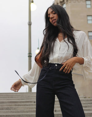 Lily, our wide leg silhouette, is wide throughout the hip and leg. Featured in Abel, this high waisted jean is a dark indigo wash, and is styled with a small D-ring belt loop adding a sophisticated touch.