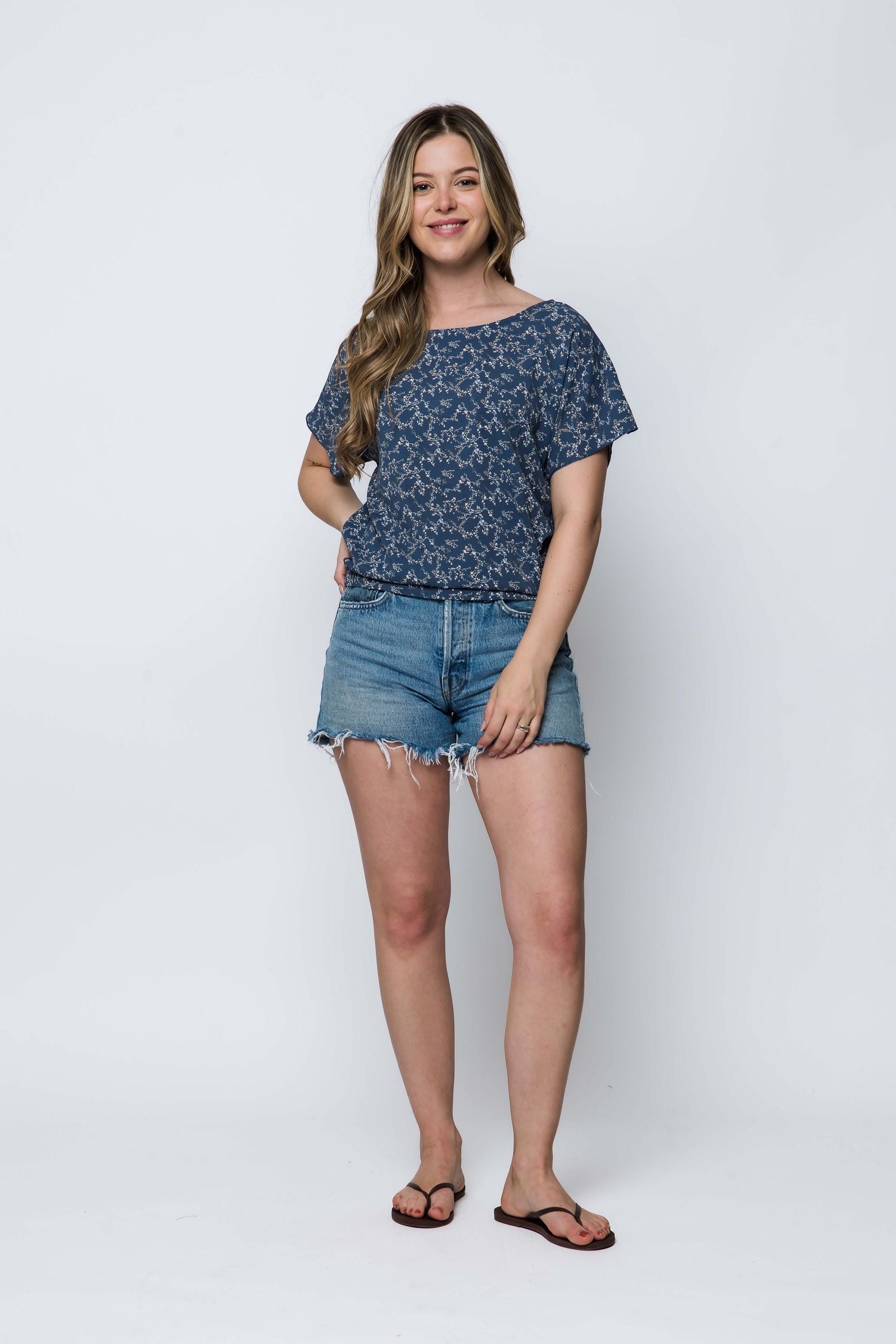 Lightweight tee with dolman sleeves. Available in printed blue vines and eyelet white fabric.