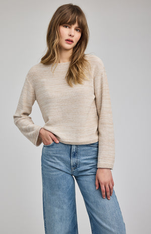 The Angie sweater is made of a yarn with a slub effect in a reverse jersey stitch. Features include a boat neckline and rolled hem details for a casual feel.