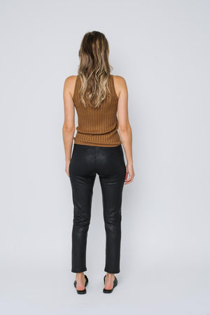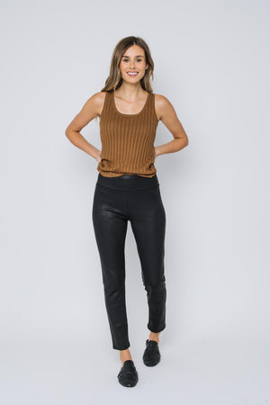 This is such a great pant - the fabric is a super soft, super stretchy fleece, with a faux leather finish. Get the trendy leather look, but in a stretch fleece feel! They are a pull-on, wide waistband style with a straight leg. Polished, classic style but feels like you're wearing fleece leggings.