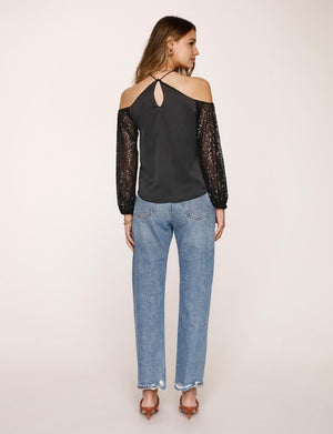 Holiday ready. The Chase Top is perfectly constructed of hammered satin with sparkly sequined blouson sleeves. The halter neckline is perfect for showing just a touch of skin. Pair with jeans and heels the perfect night out look.