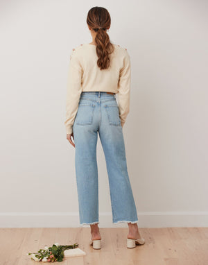 The Chloe straight fits slim through the hip and thigh and has a straight silhouette from the knee down. This high-rise straight jean features a 27" inseam and a cropped length at ankle. This light blue wash with subtle whiskers gives off true vintage vibes with its distressed details and raw hem.