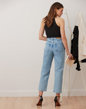 The Chloe straight fits slim through the hip and thigh and has a straight silhouette from the knee down. This high-rise straight jean features a 27" inseam and is a cropped length at ankle. This style comes in a light blue wash with subtle whiskers.