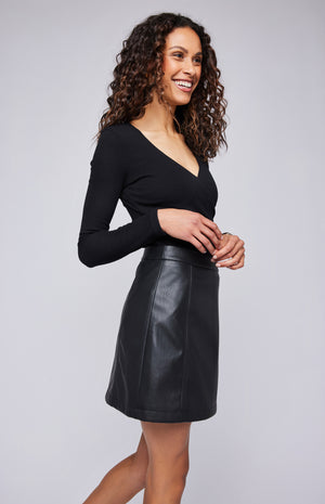 The Chrissy skirt is made of a soft faux leatherette and is fully lined for ease of wear. Features inclulde topstitching details and side seam invisible zipper.