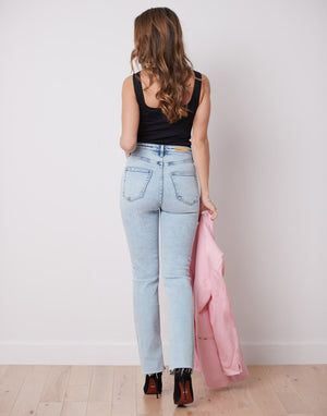 DAPHNE is light blue denim with slits at the inside of the leg opening for a trendy look. These high-waisted jeans feature a subtle distressing above the left pocket, raw hems, and a 31" inseam.