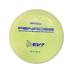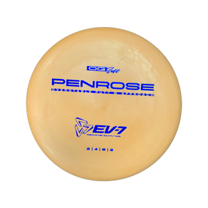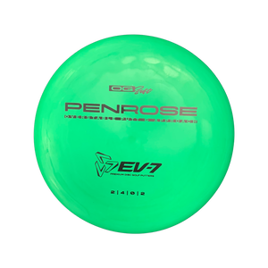 The Penrose is EV-7's debut putt and approach disc. It has reliable high-speed over stability and resistance to turn, but is uniquely straight with consistent fade at lower speeds on the putting green. With a slightly deeper profile, small bead, and smooth feel, the Penrose fits the hand comfortably, inspiring confidence for both putts and upshots.