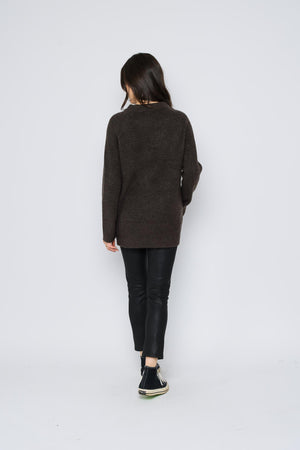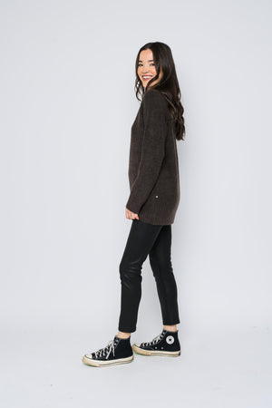 In our softest yarn, with a mohair style yarn finish for a lofty look, this pullover features a textural rib stitch, and fully fashioned raglan sleeves with rib knit detailing. Super stretchy fabric with a slouchy fit, this is 29" length from shoulder to hem. It tucks under nicely for a shorter look, or wear it long for a cozier feel!