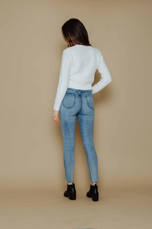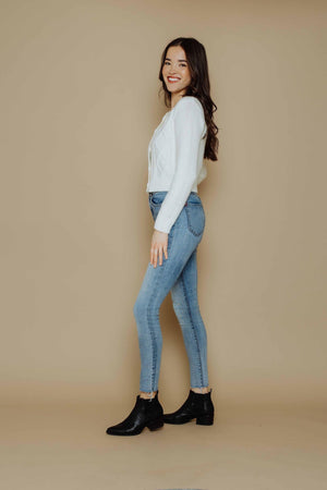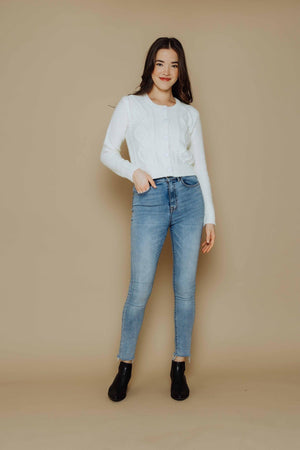 This round neck, long sleeve cardigan is vintage inspired in the yarn, matching buttons and pretty cable detailing but updated with a slightly shrunken fit for a modern feel. Feminine and soft, it's a unique and pretty piece that can easily be thrown on casually, with jeans or dressed up, as well! Body length is 20" from high shoulder point.