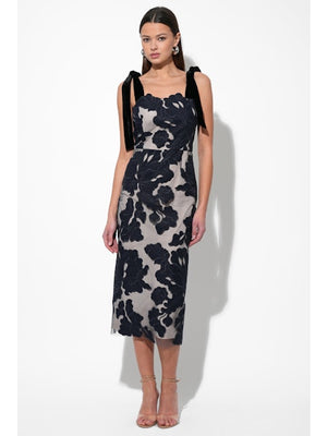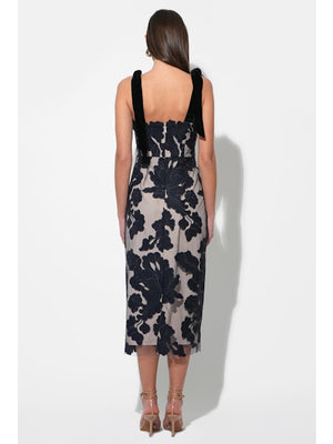 It features a nude-colored base fabric that is overlaid with a sheer navy mesh and adorned with a large, intricate, floral embroidery pattern in navy. The dress has a flattering midi length and a pencil-style silhouette that is fitted through the waist and hips.