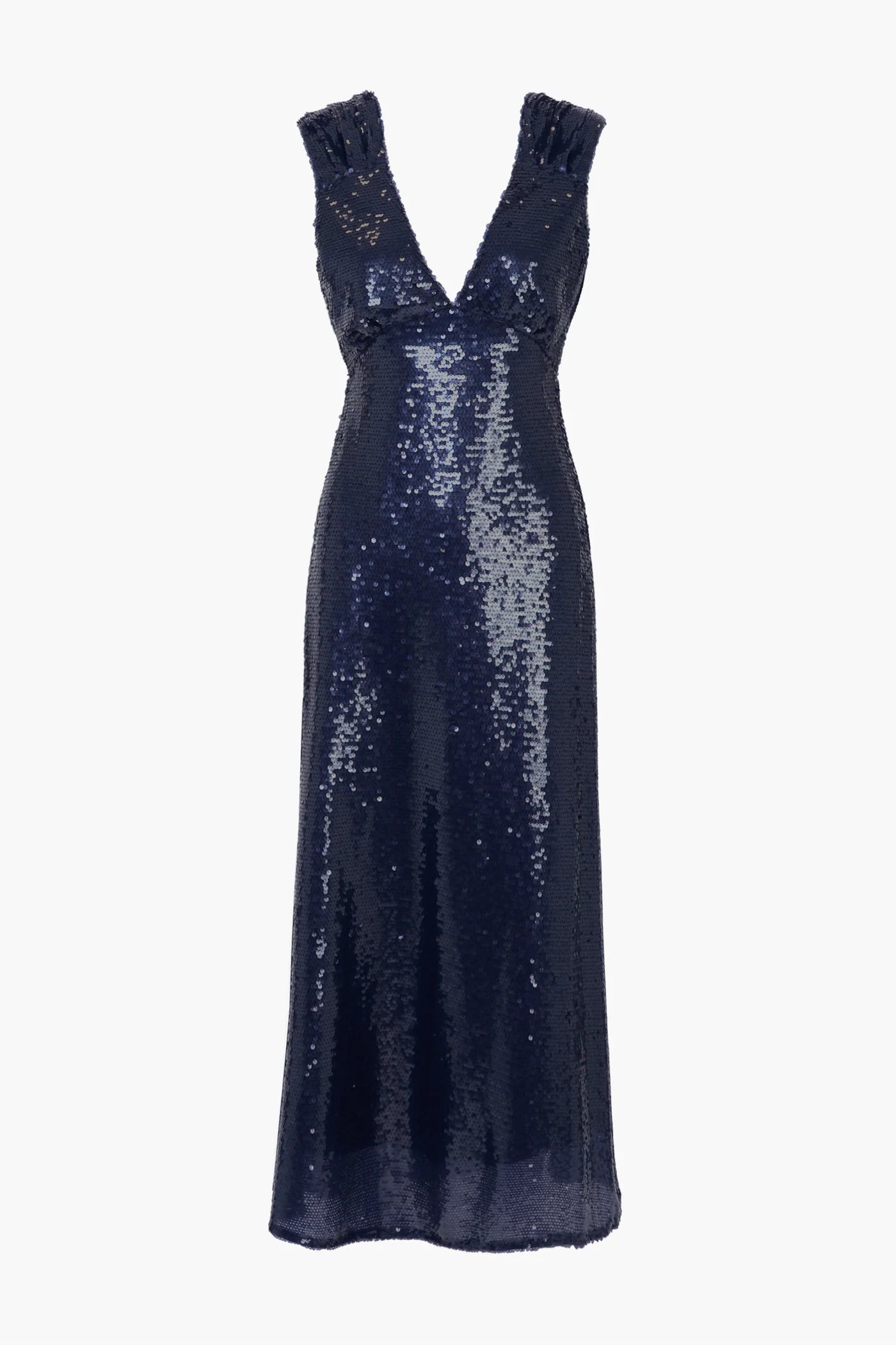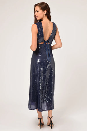 Crafted of sequin fabric for a melted metallic look, this dress features a tie back and a deep v-neck that will flatter your figure. Perfect for any special event, the Konnie will make you the center of attention.