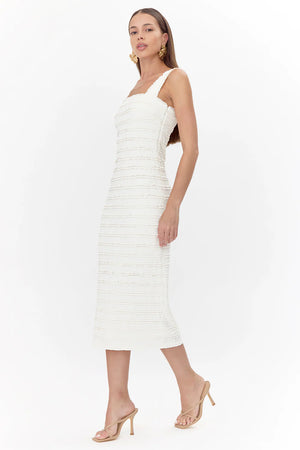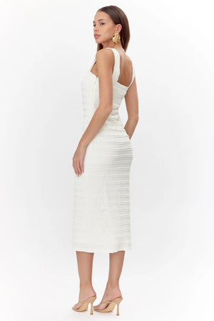 Sleeveless, midi dress rendered in a textured cream. The silhouette features a square neckline and thick shoulder straps, finished with a forming fit. Fit in easily with the hidden side zipper.