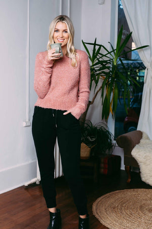 This super cute slim fit crew neck sweater is made in the softest stretch yarn with a boucle texture. You'll want to live in this! Meant to hit at the high hip, this slightly shorter (but not cropped) style is perfect with high waisted jeans.