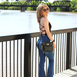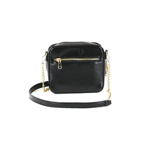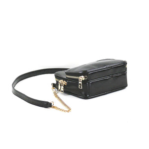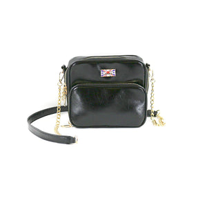 Our Liberty Crossbody Bag has a softly structured shape with dual full wrap zip top closures, perfect for a casual day out and about. Shown in New York Blue with dark silver metal accents and zippers, it has a 46” detachable chain accent shoulder strap. Made from vegan leather.