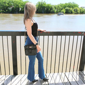 Front: Wallet section with full length zipper opening (7” x 5 ½”).