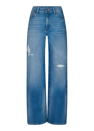 Crafted in a true indigo wash, these classic-rise, 32” inseam jeans feature subtle distressing and light whiskers for a chic, lived-in look. The wide-leg design adds a touch of effortless style.