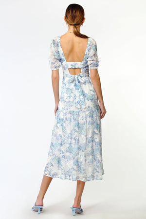 Sweeten the occasion in this eyelet embroidered midi styled with shapely faux front wrap, open back with an elastic band and self-tie detail, finished with charming puff sleeves.