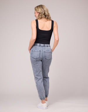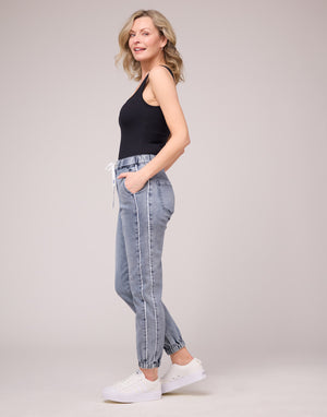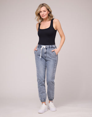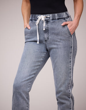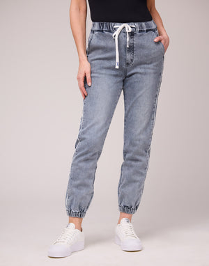 These high-rise denim joggers are a light blue wash with a subtle acid-wash effect and have a white lining on the sides. They feature an elastic waistband, front slant pockets, and a drawstring, making them the perfect choice for chilling out at home in style and comfort or to throw on while running errands.