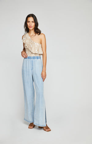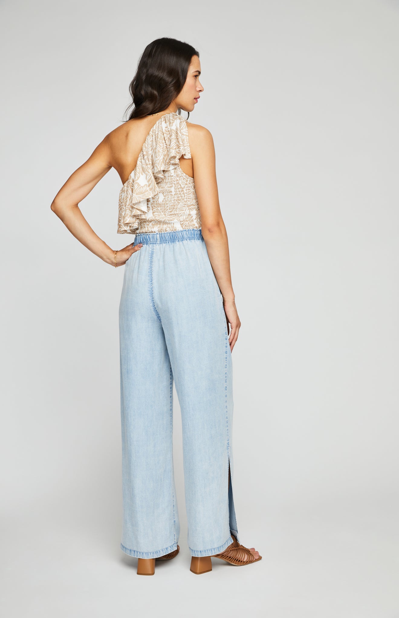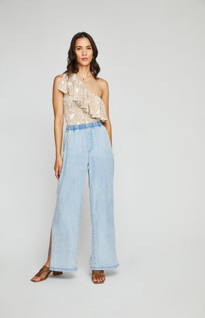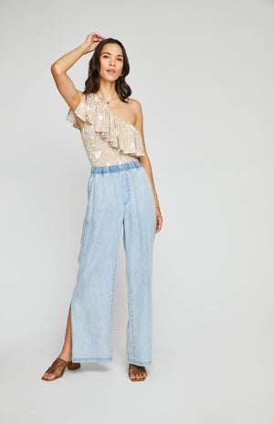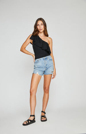 The Margot tank is made of a soft knit fabric with a textured effect. Features include a smocked bodice and asymmetrical ruffle detail.