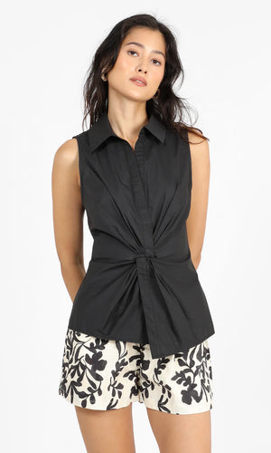 Made with a structured collar and a sleek sleeveless silhouette, this top features a twist-front detail that cinches the waist for a flattering, modern shape. The crisp cotton-blend fabric keeps it polished yet breathable, making it perfect for work-to-weekend styling.