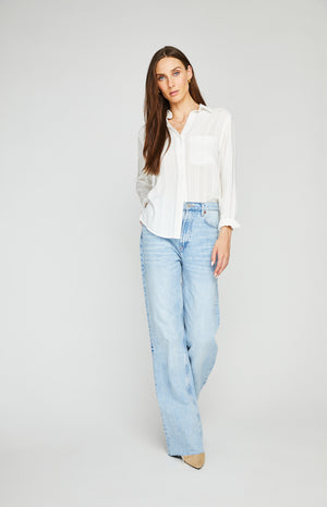 The Paige is a classic button-up silhoutte reimagined in a fabric with a textured tonal stripe. Wear it as is or worn open for an effortless look.