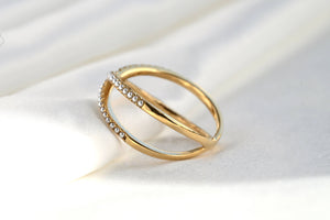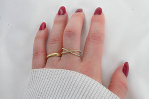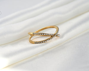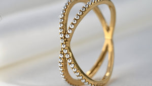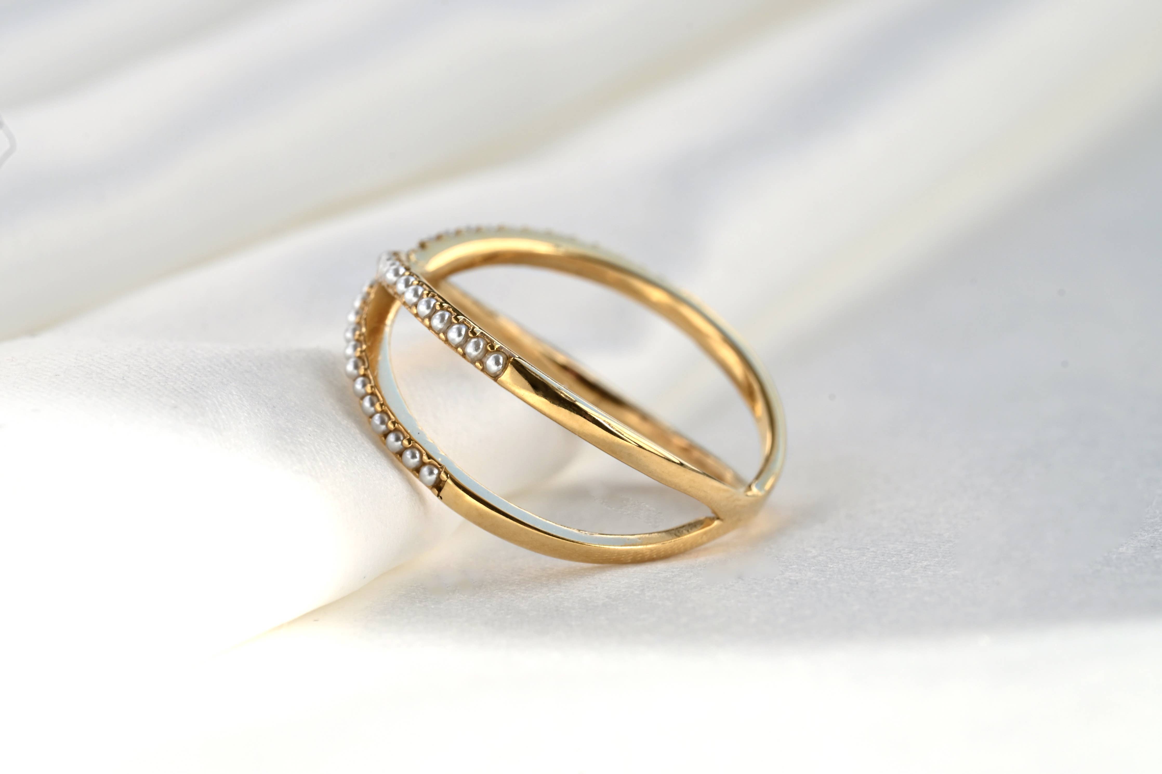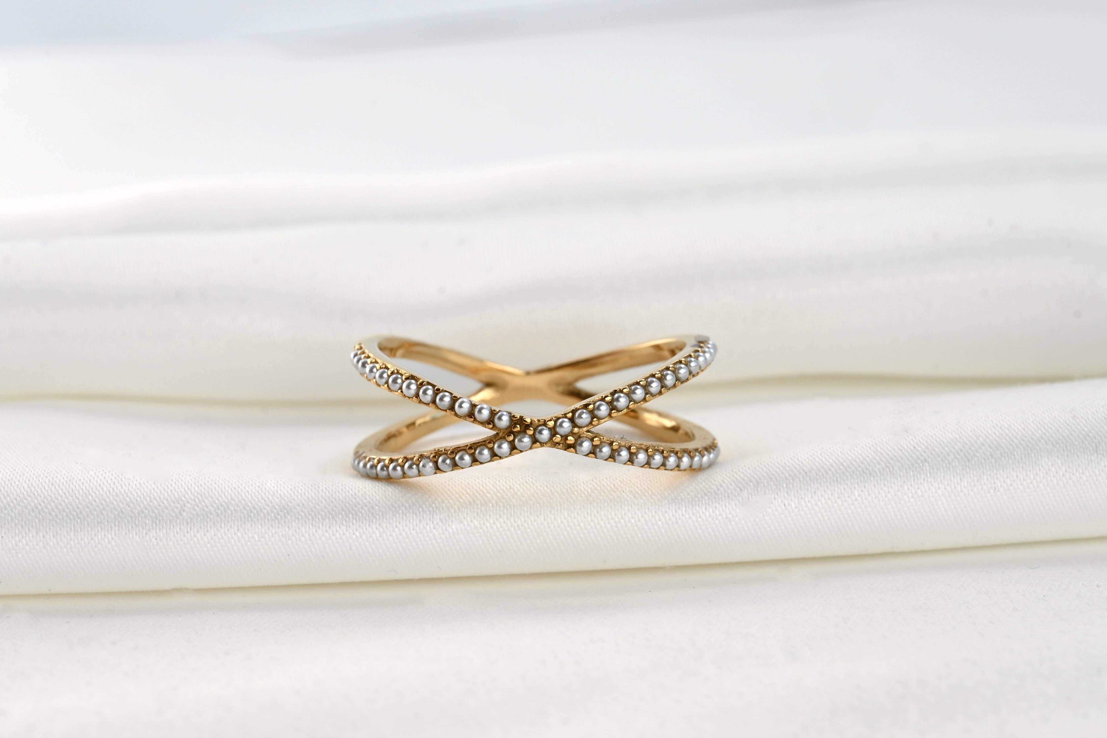 Made in 18k Gold PVD plated stainless steel and set with mini imitation pearls in a pave setting, this waterproof X ring features a gentle overlap of the X and is a piece you will hold on to forever. Pair it with dainty rings to create a stack. Material: Stainless Steel Band Width: 6 mm Size: 6, 7, 8 Colour: Gold