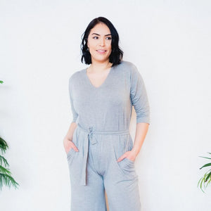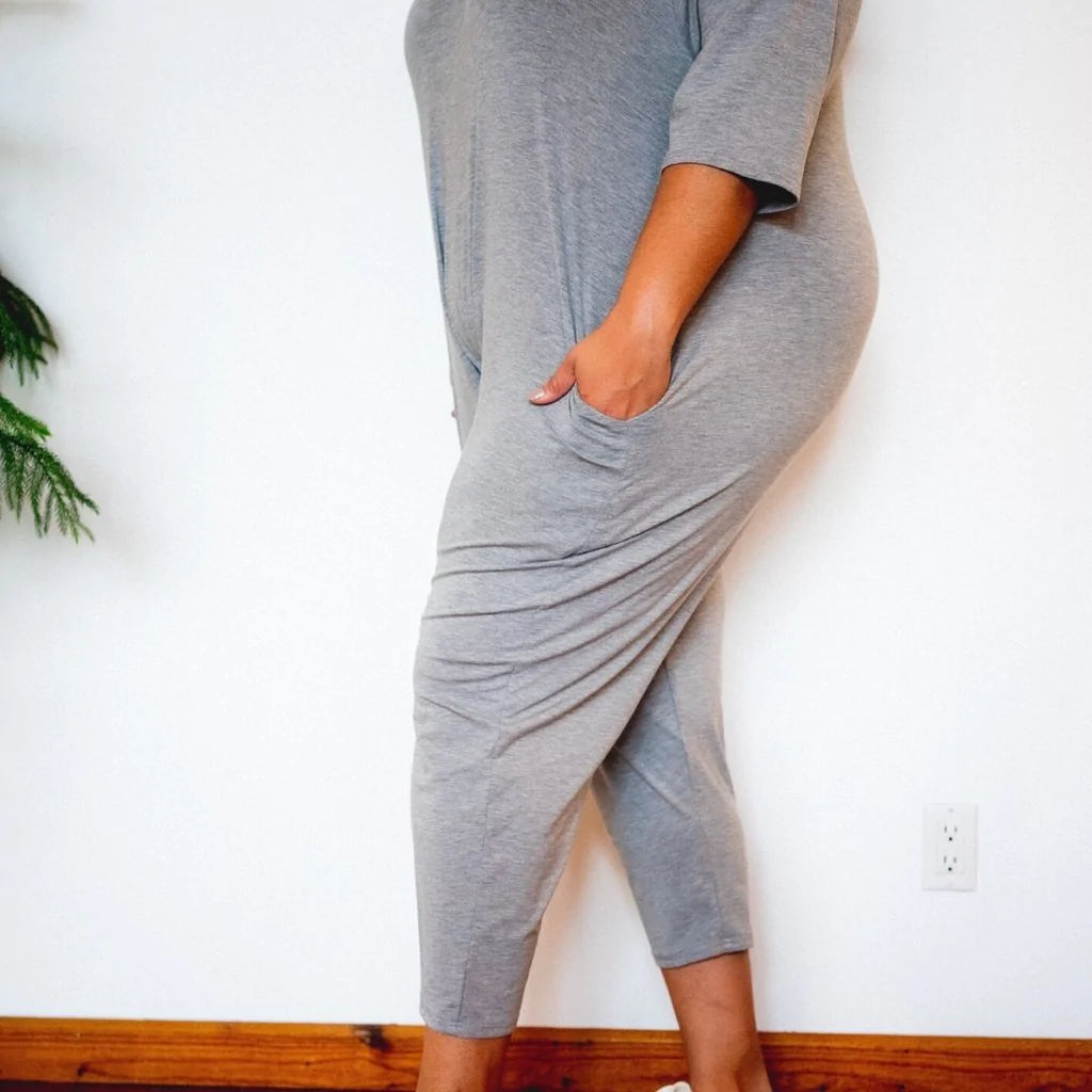 Relaxed, tapered leg jumpsuit with 3/4 sleeves, pockets and a matching detached belt.
