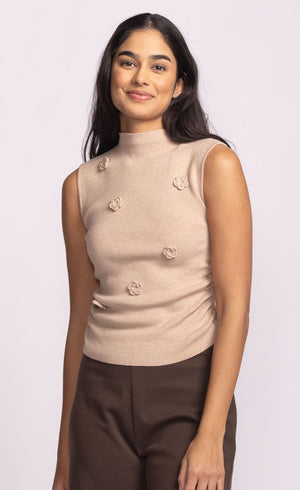 Sleeveless turtle neck sweater with 3D tonal florals in super soft knit. Pair with the Harmon Cardi for a cozy sophisticated look.