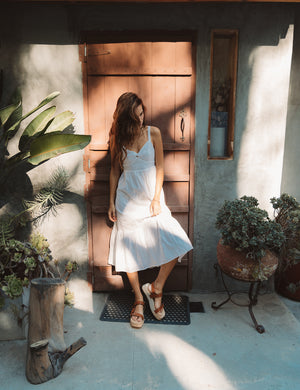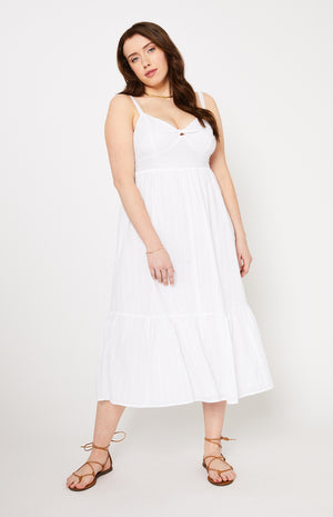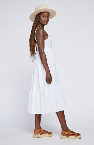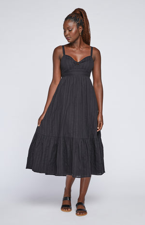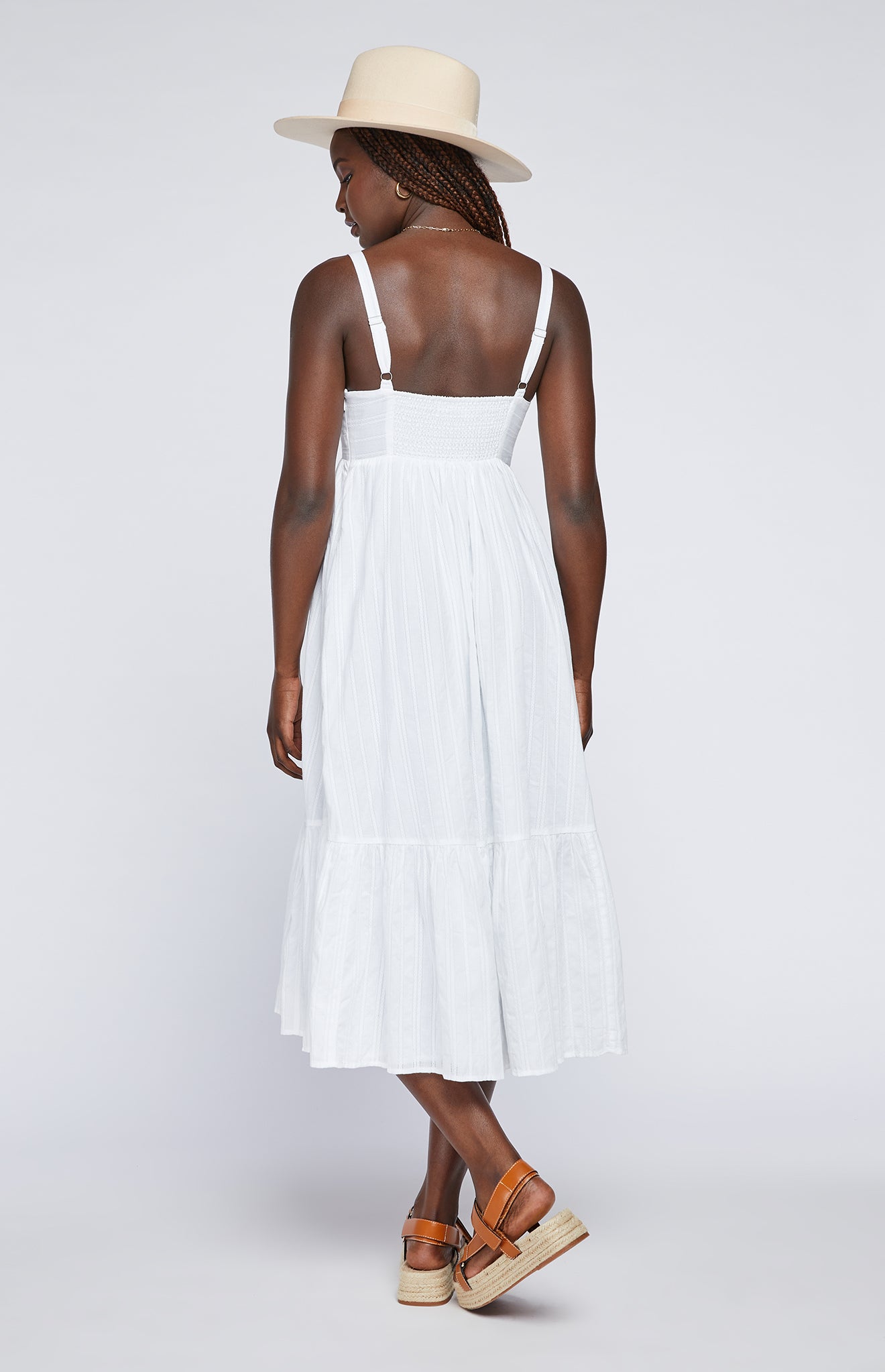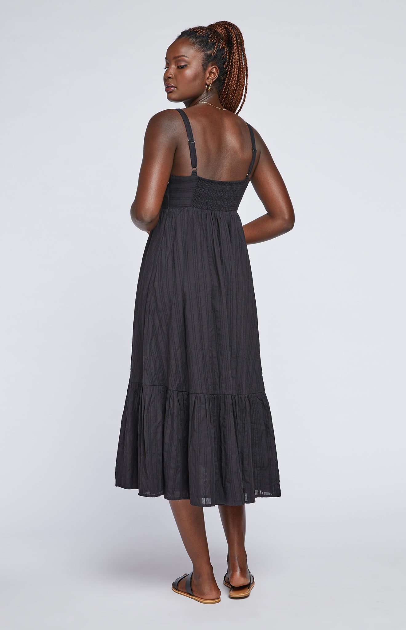 The Shae dress is made of a textured cotton stripe fabric and is fully lined. Features include adjustable straps, front twist detail, and back smocking panel for ease of wear.